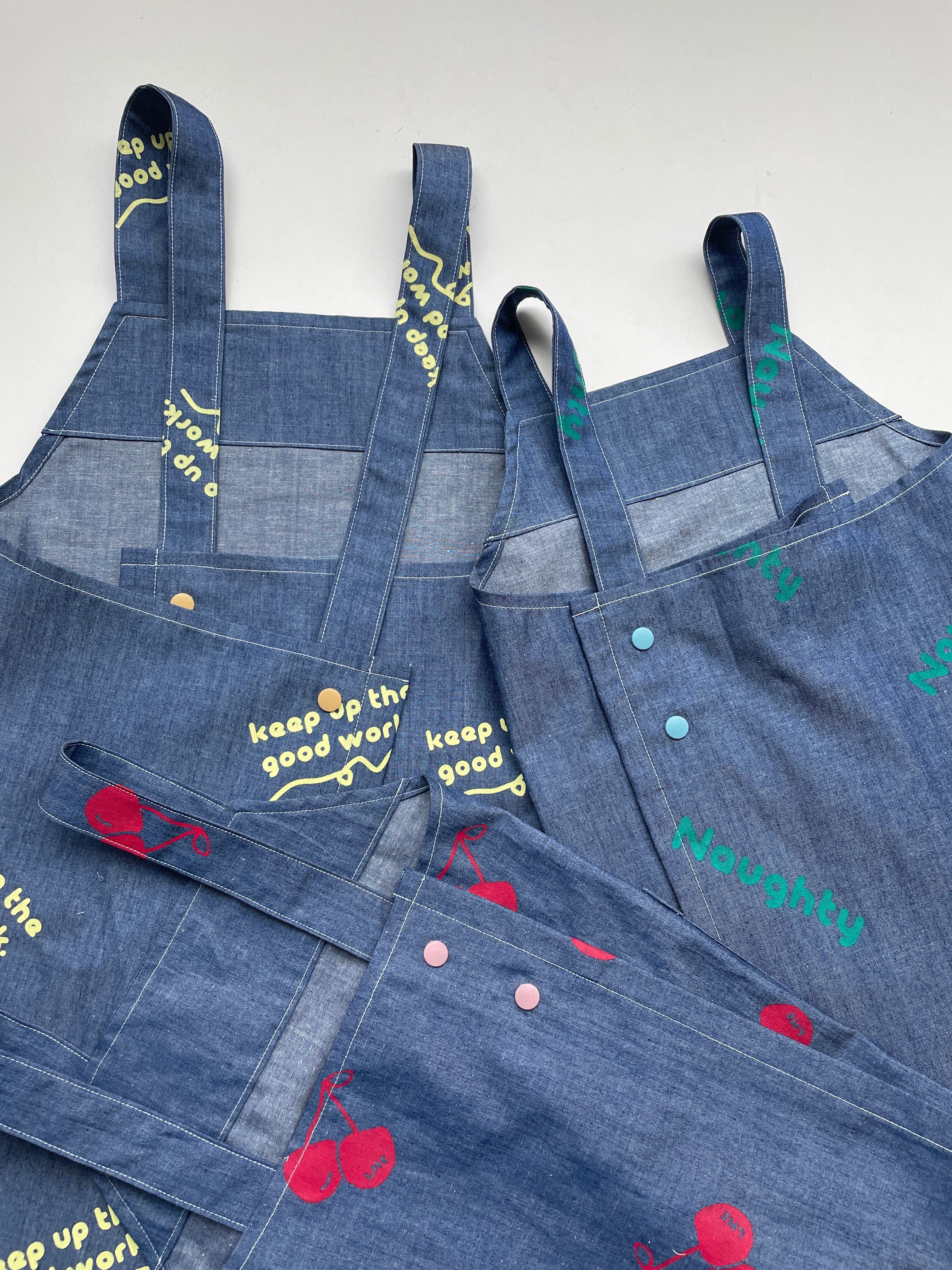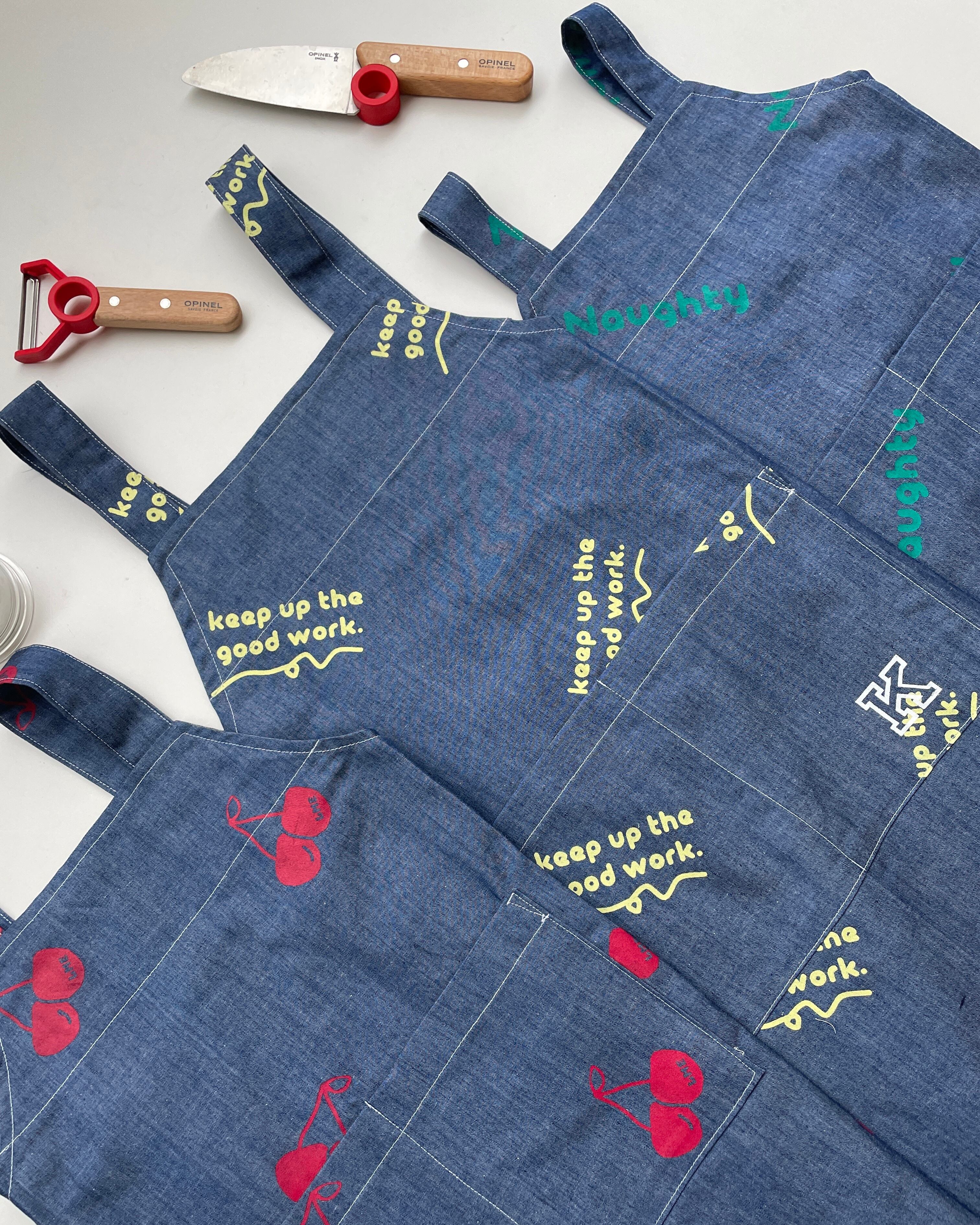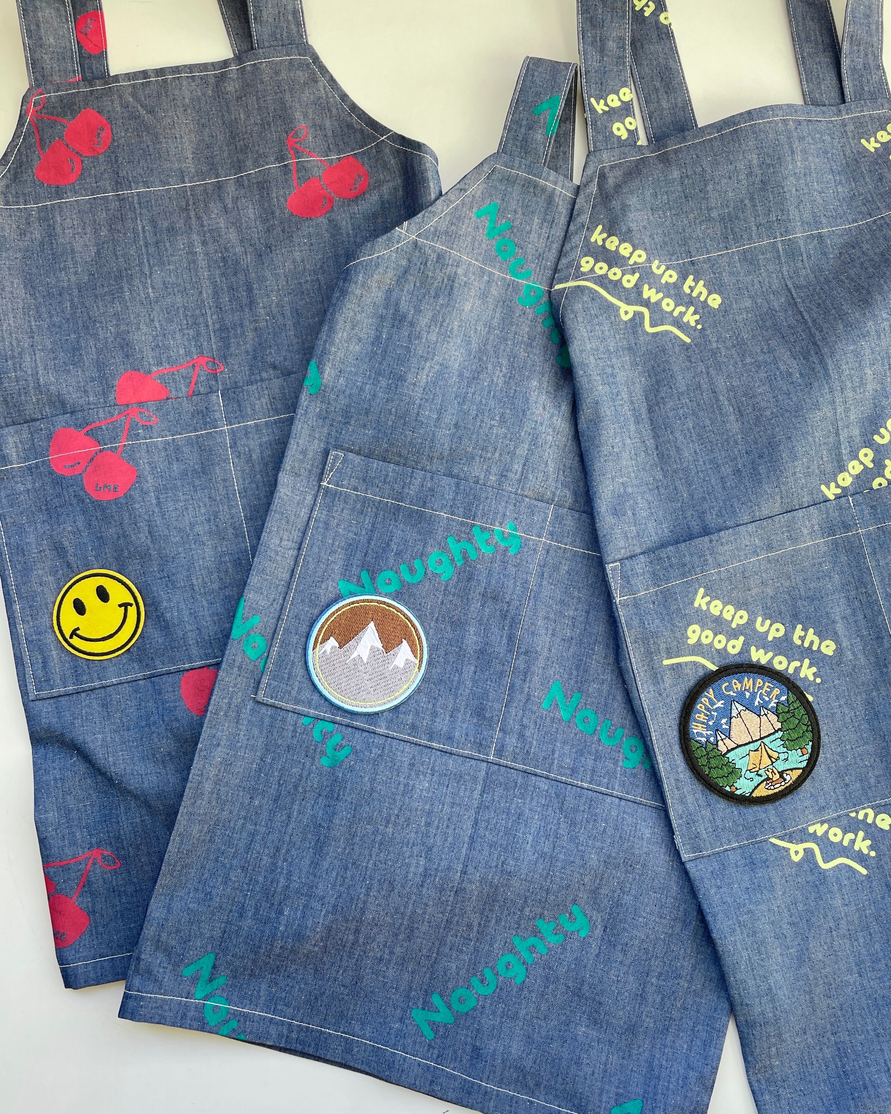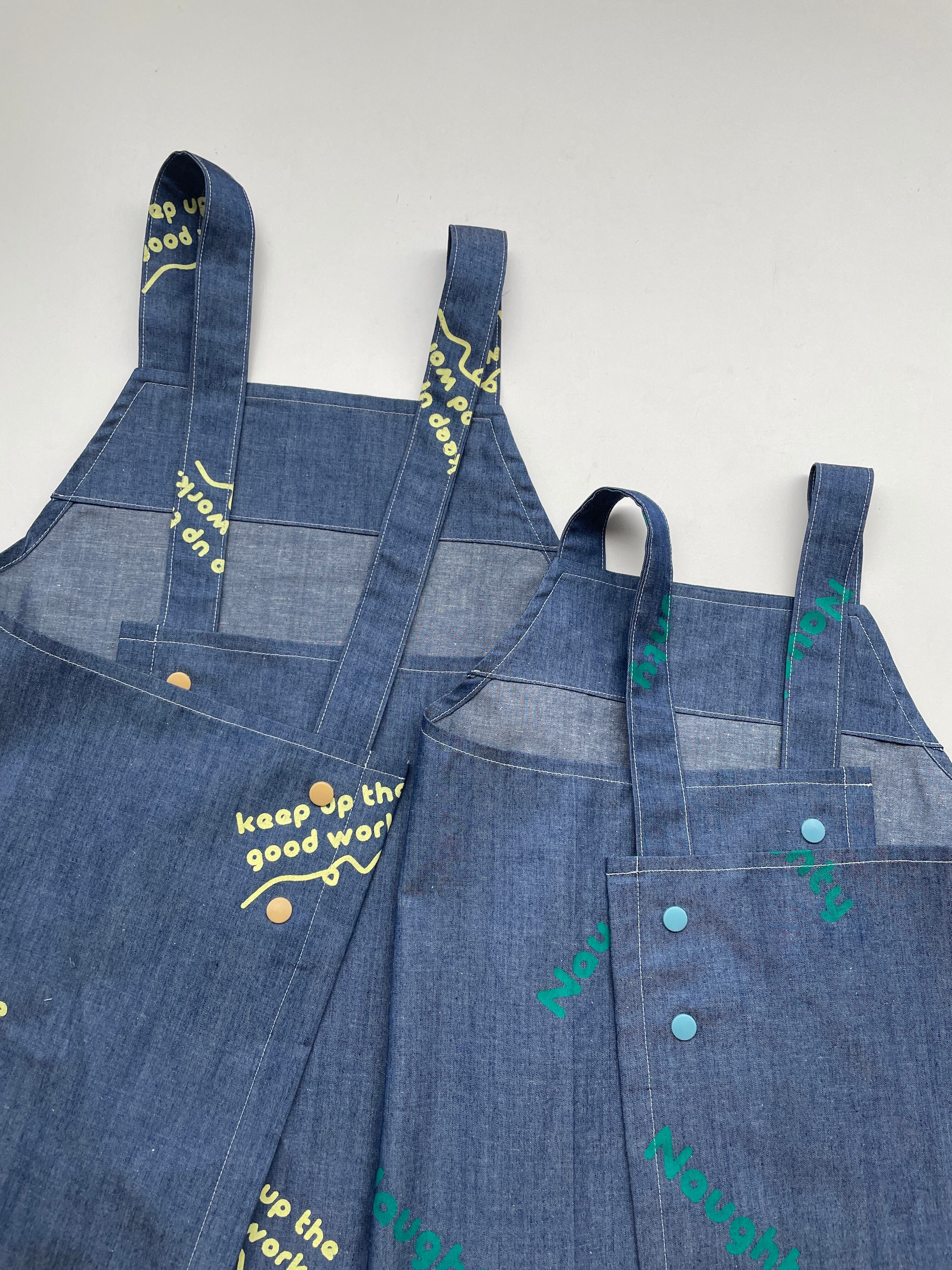 薄手のデニム生地にオリジナル総柄をプリントしたキッズ用エプロンです。