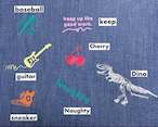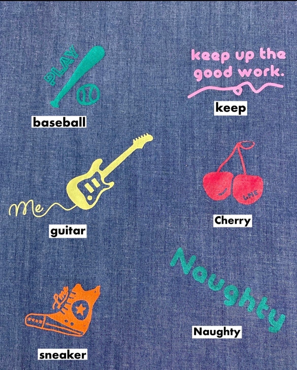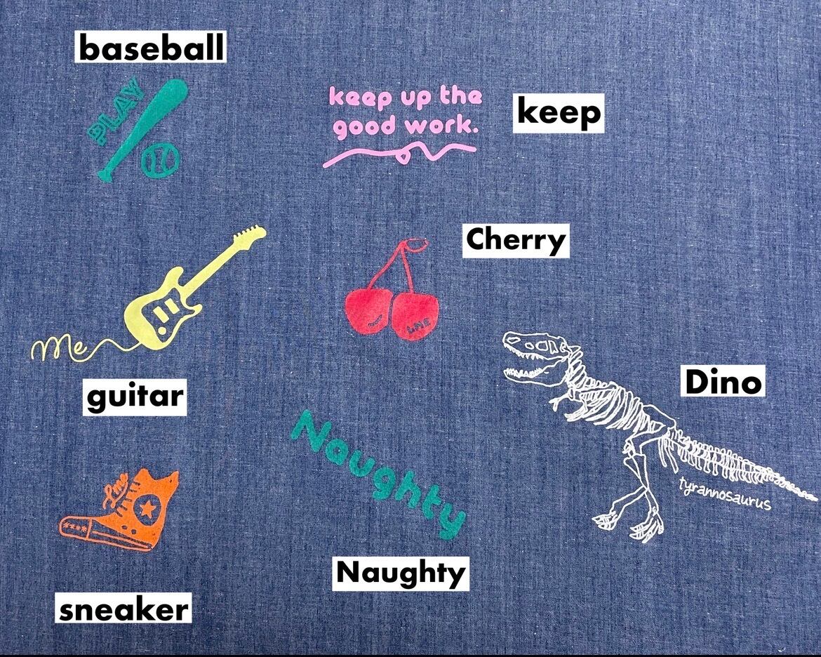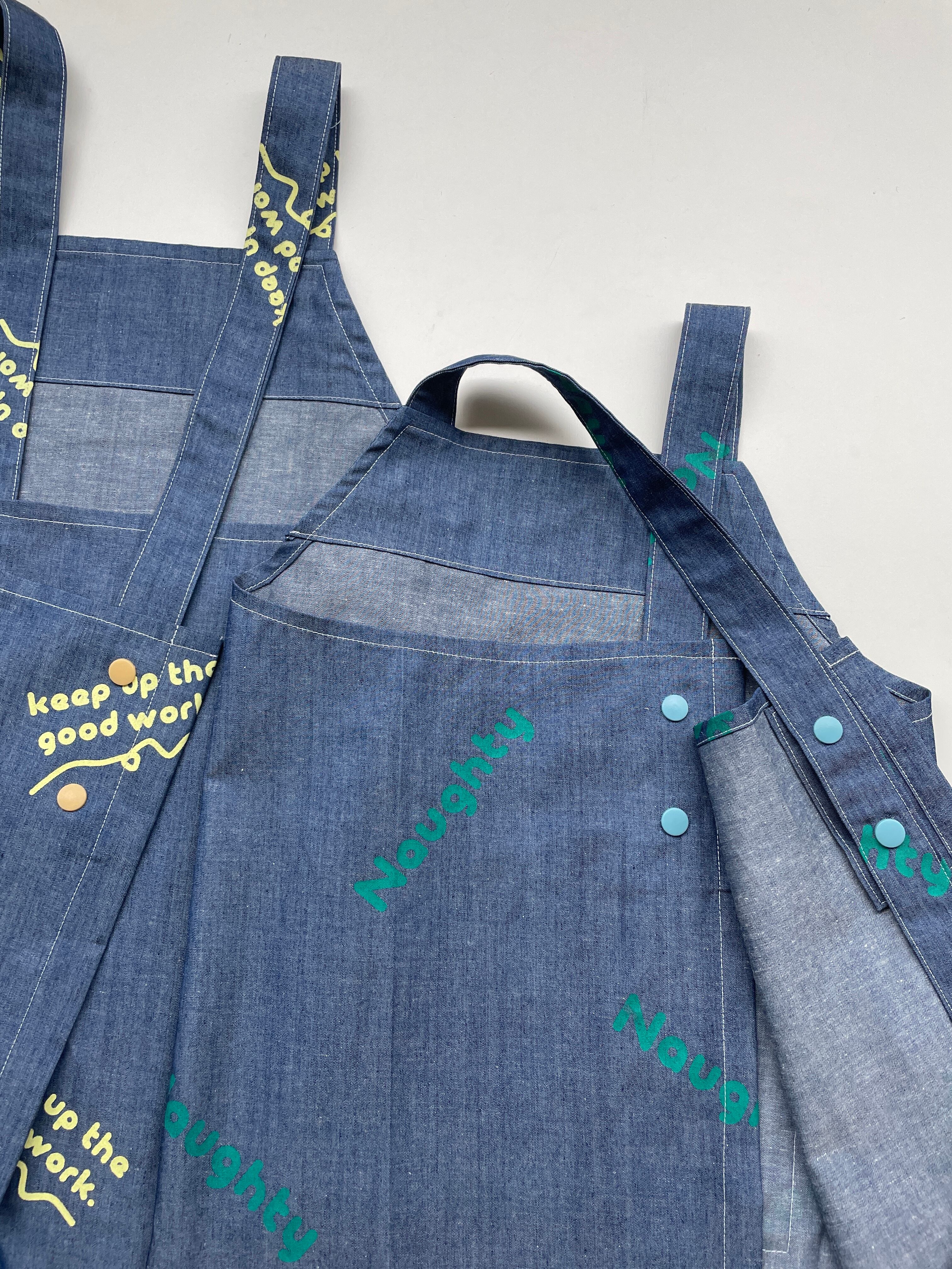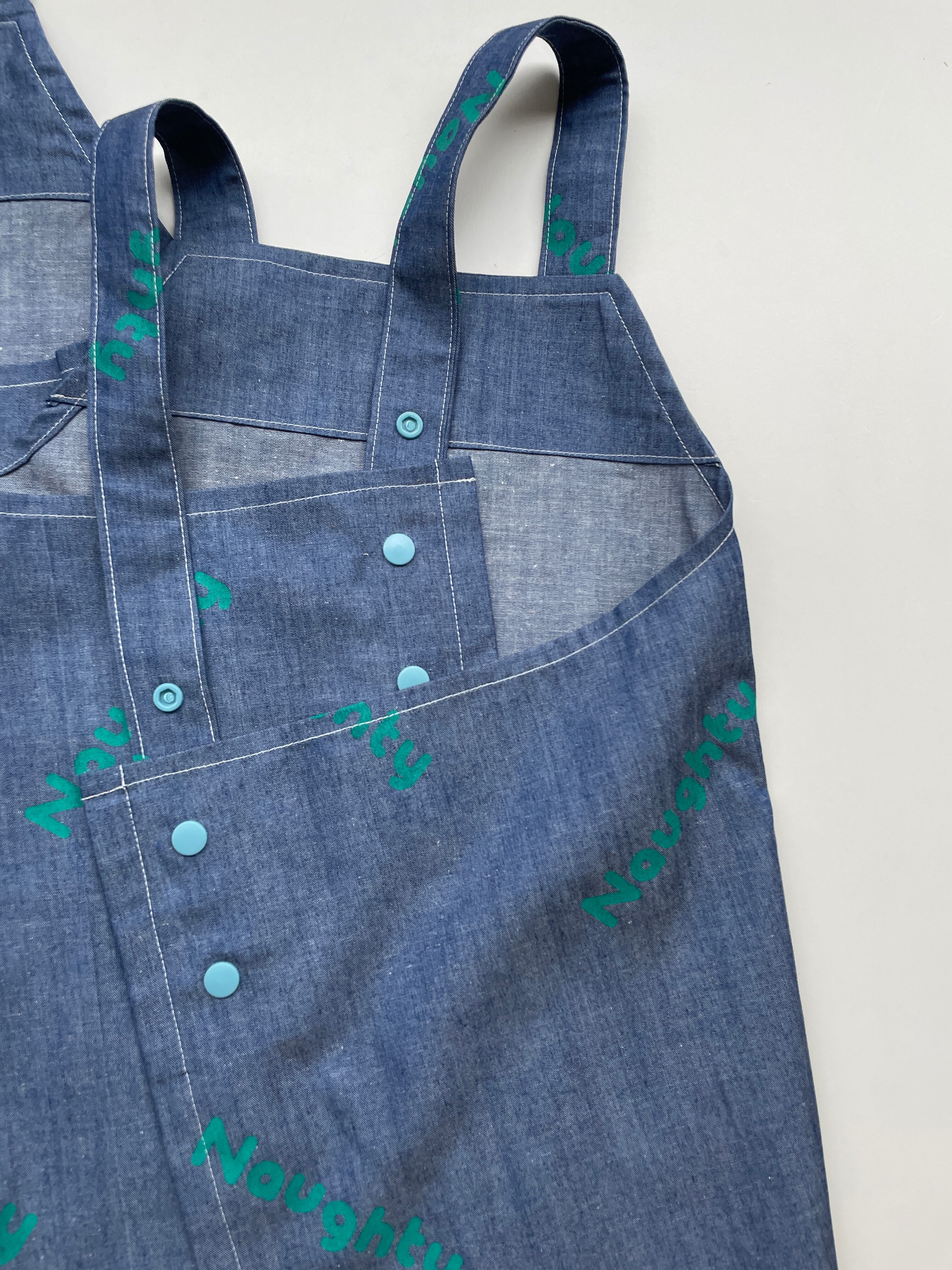 薄手のデニム生地にオリジナル総柄をプリントしたキッズ用エプロンです。